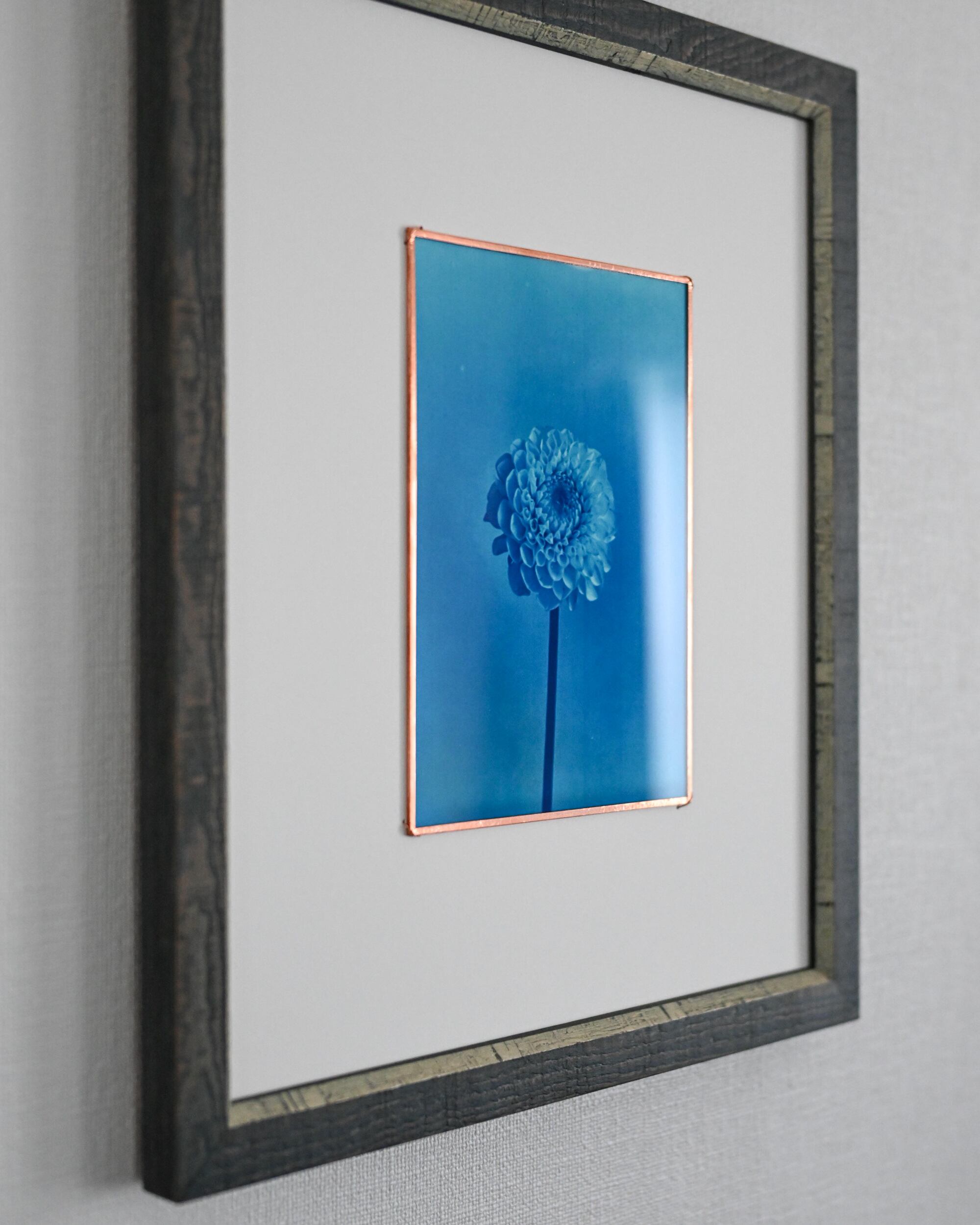 青写真は、自然の植物や葉などを用いて作られたプリントアートです。独特な青い色合いと緻密なディテールで、洗練された美しさを演出します。サイアノタイププリントの製作工程は、一つ一つ丹念に手作業で行われるため同一の作品はございません。